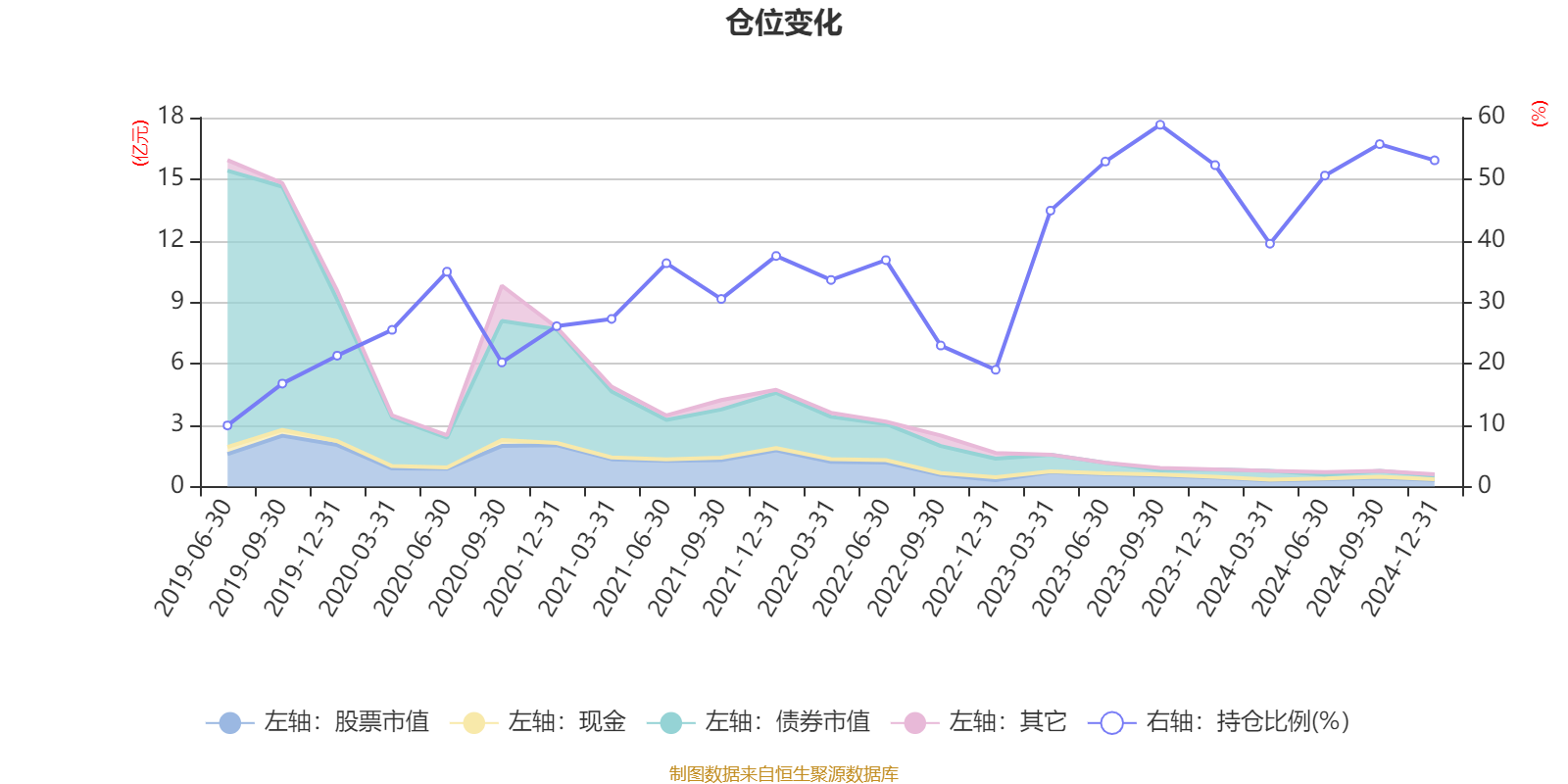 据定期报告数据统计,近三年平均股票仓位为43.33%,同类平均为45.78%。2023年三季度末基金达到58.84%的最高仓位,2019年上半年末最低,为9.94%。
